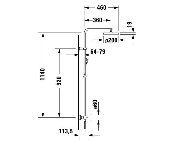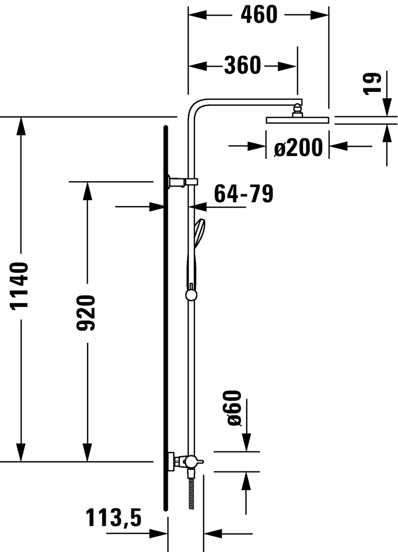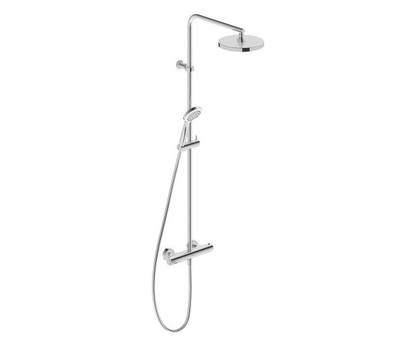 控温器盒, 安全温度定在38°C, 连接件尺寸 DN15, 软管连接件 DN15, 流率 15,3 升/分钟 (3 bar), 花洒喷头角度可调调节, 旋转淋浴臂, 高度可调节的手持花洒柄, 连接软管内有止回阀, 包括:淋浴管 1600 mm, 手持花洒 Ø 97, 顶部花洒 Ø 200 mm, 推荐在压力 3-5 bar下进行操作, 表面镀铬, 1220 mm