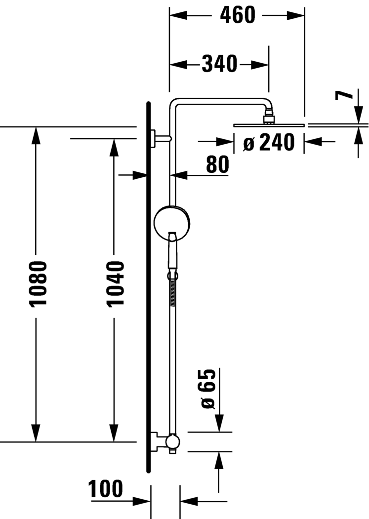控温器盒, 安全温度定在38°C, 连接件尺寸 DN15, 软管连接件 DN15, 流率 12,6 升/分钟 (3 bar), 花洒喷头角度可调调节, 高度可调节的手持花洒柄, 连接软管内有止回阀, 伸出长度350mm, 包括:包括淋浴软管1600mm,,手持花洒air Ø 120 mm,淋喷头 Ø 240 mm, 推荐在压力 3-5 bar下进行操作, 1200 mm