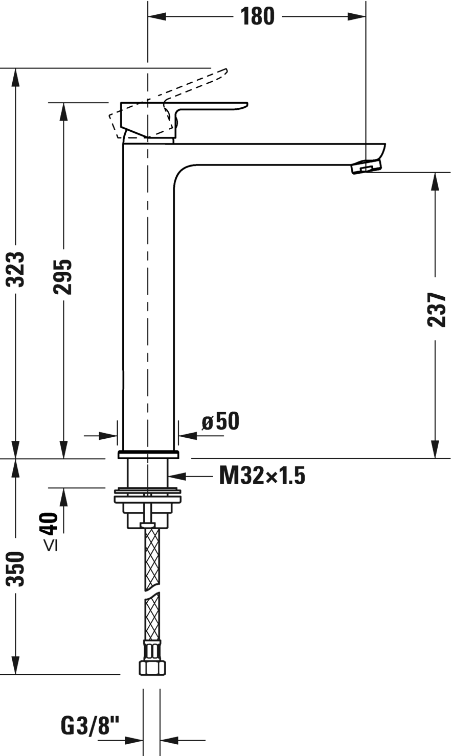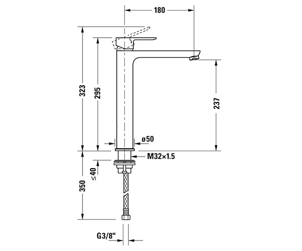 型号 A11040002 陶瓷混合系统, 伸出长度 180 mm, 连接软管 3/8", 标准喷雾, 表面镀铬, 温度范围可调节, 推荐在压力 3-5 bar下进行操作, 不带下水器套装, 295 mm 尺寸 295 mm 可变形式 流量率 5,6 升/分钟(3个) A11040002010