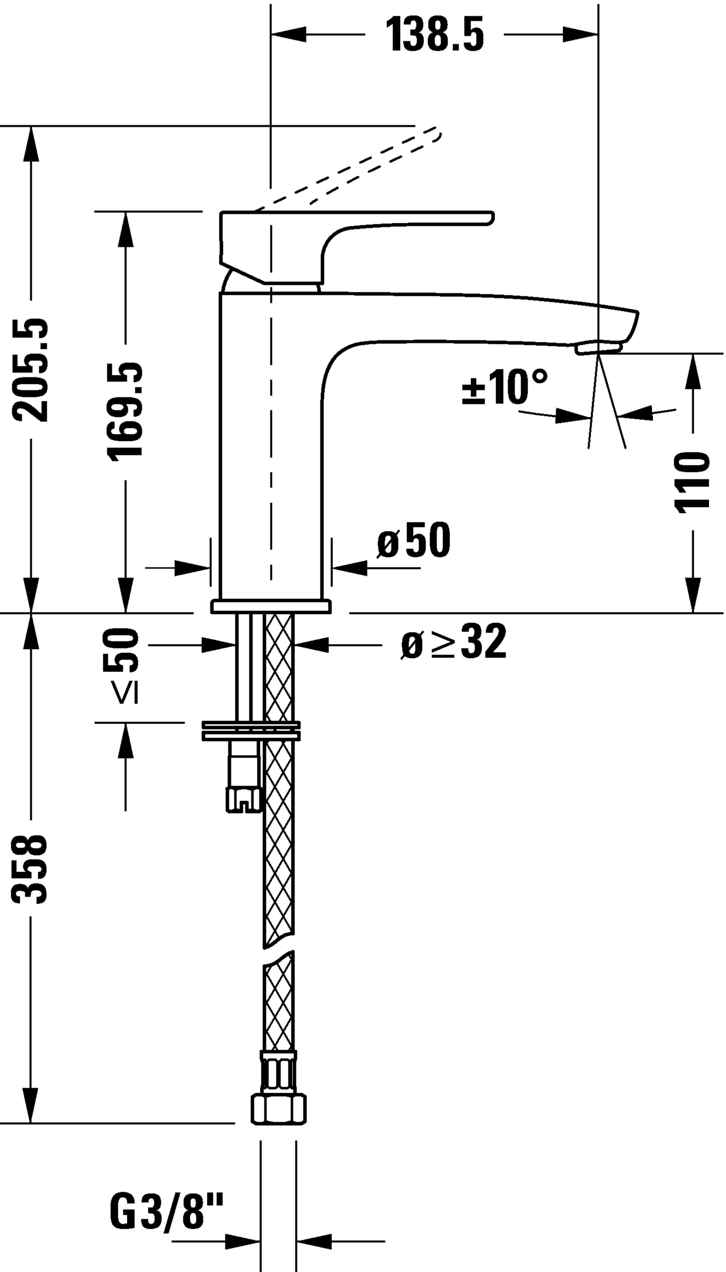 陶瓷混合系统, 伸出长度 139 mm, 连接软管 3/8", 起泡器可调节, 标准喷雾, 表面镀铬, 温度范围可调节, 推荐在压力 3-5 bar下进行操作, 不带下水器套装, 170 mm